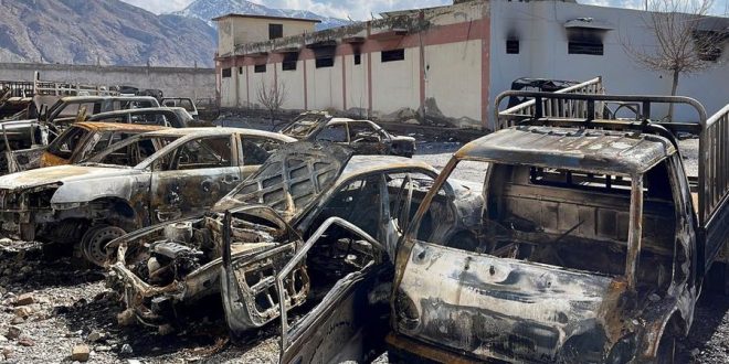 Jejak kehancuran tampak jelas di Quetta. Kendaraan hangus terbakar di halaman kantor polisi, dinding bangunan berlubang peluru, dan garis polisi membentang di jalanan.