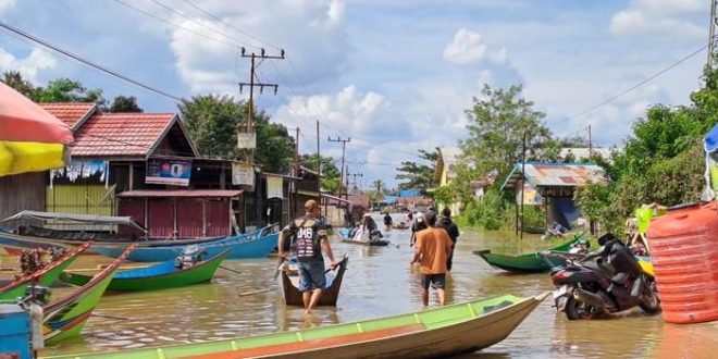 KUTAI BARAT – Aktivitas warga di Kecamatan Tering, Kutai Barat, terganggu akibat banjir yang merendam akses jalan menuju Pelabuhan Tering pada Sabtu (13/09/2025). Hingga sore hari pukul 17.00 Wita, air setinggi lebih dari satu meter masih menggenangi jalan utama menuju pelabuhan.