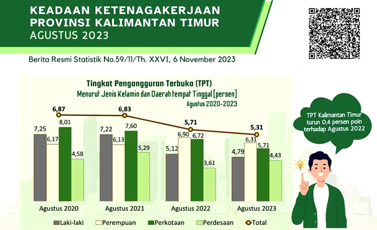 Sedangkan tingkat pengangguran terbuka (TPT) di Provinsi Kalimantan Timur Agustus 2023 sebesar 5,31 persen, turun 0,40 persen poin. Pada Agustus 2023, TPT laki-laki sebesar 4,79 persen, lebih rendah dibanding TPT perempuan yang sebesar 6,31 persen.