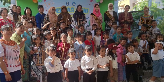 Kemeriahan berlanjut di panggung pentas seni. Penampilan angklung yang dimainkan bersama anak-anak saat membawakan lagu “Kasih Ibu Sepanjang Masa” menjadi salah satu sesi yang paling menyentuh. Interaksi Bunda PAUD dengan anak-anak memperlihatkan pendekatan pendidikan yang hangat dan inklusif.