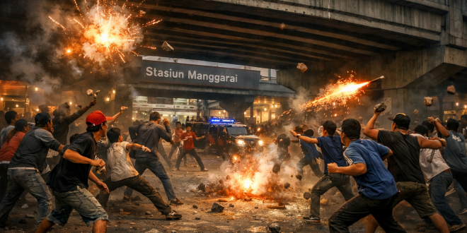 JAKARTA – Bentrokan antarwarga kembali pecah di kolong flyover Manggarai, Jakarta Selatan, pada Kamis (01/01/2026) sore. Dua kelompok warga terlibat aksi saling serang menggunakan batu dan petasan, memicu suasana mencekam di sekitar terowongan dekat Stasiun Manggarai. Peristiwa tersebut terjadi sekitar pukul 18.10 WIB dan melibatkan warga dari Gang Tuyul RW …