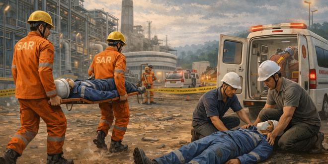 KETAPANG — Kecelakaan kerja kembali menelan korban jiwa di sektor industri energi. Empat pekerja dilaporkan terjatuh dari cerobong pembuangan setinggi sekitar 50 meter di kawasan PLTU Sukabangun, Kecamatan Delta Pawan, Kabupaten Ketapang, Rabu (21/01/2026) sore. Insiden tersebut menyebabkan dua orang meninggal dunia, sementara dua pekerja lainnya masih menjalani perawatan medis intensif.