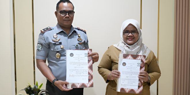 Kepala Rutan Balikpapan, Agus Salim, dan Kepala Dinas Kesehatan Kota Balikpapan, Dra. Alwiati, A.Apt, menandatangani perjanjian tersebut, disaksikan jajaran terkait termasuk Kasubsi Pelayanan Tahanan, Adi Nugroho.