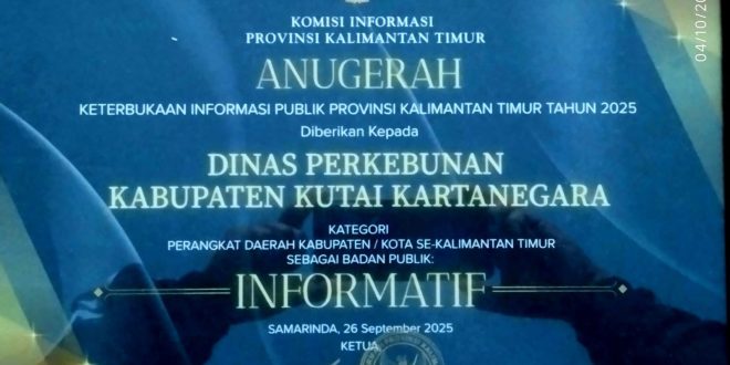 “Penghargaan ini menjadi bukti nyata dari komitmen kami untuk terus memberikan pelayanan informasi yang mudah diakses dan transparan bagi masyarakat. Keterbukaan informasi bukan hanya kewajiban administratif, tetapi sudah menjadi bagian dari budaya kerja di Disbun Kukar,” ucap Taufik.
