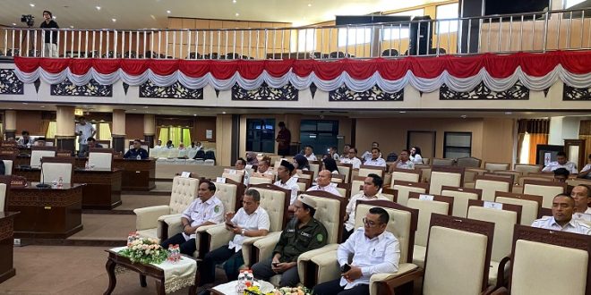 Didampingi Kepala Bidang Administrasi Pemerintahan Desa, Poino mengikuti jalannya rapat yang membahas tanggapan terhadap pandangan umum fraksi-fraksi DPRD mengenai tujuh Rancangan Peraturan Daerah (Raperda), salah satunya terkait pembentukan tujuh desa persiapan di berbagai kecamatan.