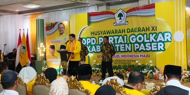 PASER — Dewan Pimpinan Daerah (DPD) Partai Golkar Kabupaten Paser menggelar Musyawarah Daerah (Musda) ke-XI dengan tema “Golkar Solid, Indonesia Maju” di Ballroom Hotel Bumi Paser, Rabu (25/02/2026). Kegiatan ini menjadi forum konsolidasi internal partai dalam menentukan arah kepemimpinan dan strategi politik ke depan, khususnya menghadapi kontestasi legislatif dan pemilihan kepala daerah.