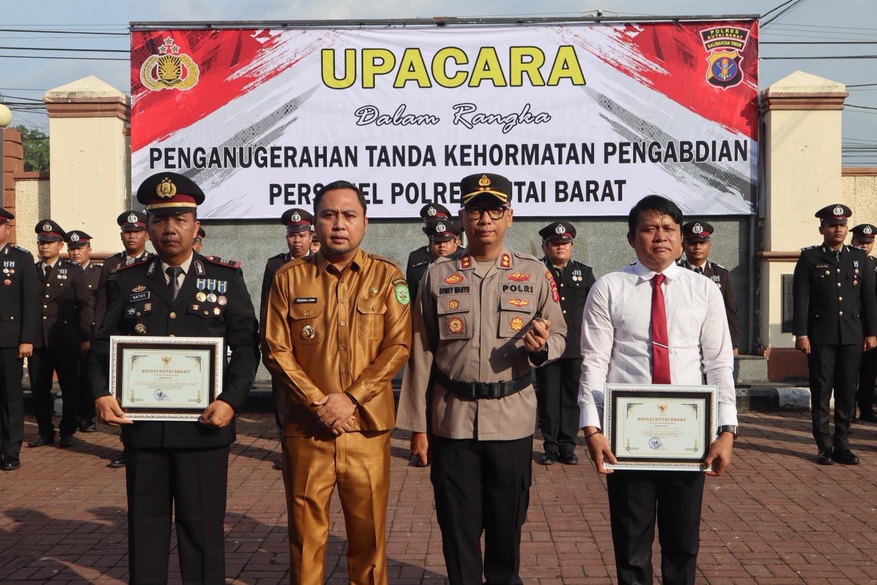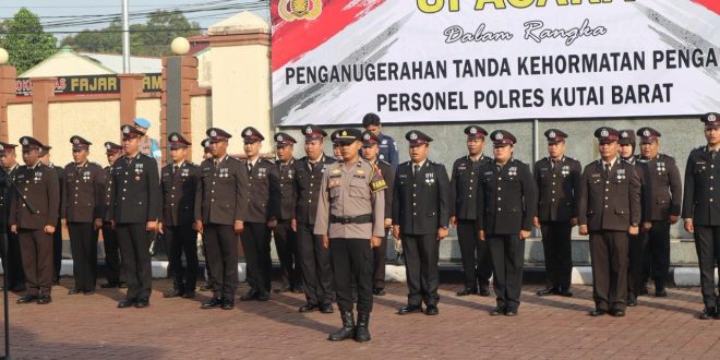 KUTAI BARAT – Kepolisian Resor (Polres) Kutai Barat menggelar upacara penganugerahan Tanda Kehormatan Satyalencana Pengabdian kepada sejumlah personel, yang dirangkai dengan penyerahan penghargaan dari Bupati Kutai Barat kepada Polsek Melak atas keberhasilan mengungkap kasus pencurian aset daerah. Kegiatan ini menjadi bentuk apresiasi atas dedikasi dan kinerja aparat kepolisian dalam menjaga keamanan serta menegakkan hukum di wilayah Kutai Barat.