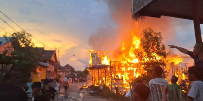 KOTAWARINGIN BARAT – Warga Jalan Merdeka, Rt 01, Kecamatan Kotawaringin Lama, Kabupaten Kotawaringin Barat, dibuat panik akibat musibah kebakaran yang melanda tiga rumah dan satu gedung sarang walet, Jumat (06/12/2025). Meski tak menimbulkan korban jiwa, seluruh bangunan yang terbuat dari kayu itu rata dengan tanah.