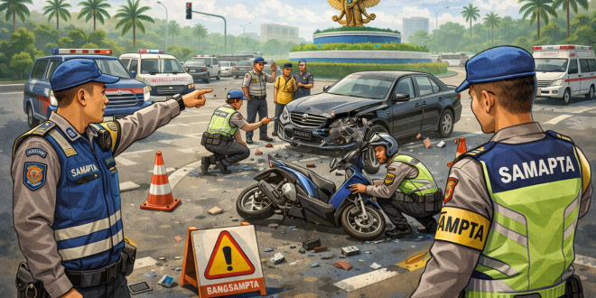 PALANGKA RAYA – Personel Satuan Samapta (Satsamapta) Polresta Palangka Raya menunjukkan respons cepat dalam menangani kecelakaan lalu lintas yang terjadi di kawasan Bundaran Garuda, Jalan Garuda, Kelurahan Bukit Tunggal, Kecamatan Jekan Raya, Kota Palangka Raya, Minggu (11/01/2026).
