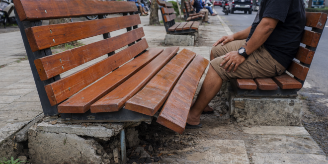 Hasil pantauan di lokasi menunjukkan papan kayu pada dudukan dan sandaran kursi terlihat melendut saat diduduki. Bahkan, di beberapa titik trotoar, struktur beton bagian bawah tampak terbuka dan terkelupas akibat tanah penyangga yang tergerus, sehingga bagian dalam konstruksi terlihat jelas.