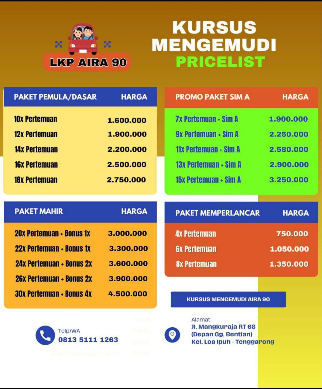 Untuk peserta yang ingin mahir, tersedia paket 20 kali pertemuan plus bonus 1 kali seharga Rp3.000.000 hingga 30 kali pertemuan plus bonus 4 kali dengan tarif Rp4.500.000. Selain itu, LPK AIRA 90 juga menawarkan promo paket SIM A, mulai dari 7 kali pertemuan plus pendampingan pengurusan SIM A seharga Rp1.900.000 hingga 15 kali pertemuan plus SIM A seharga Rp3.250.000.