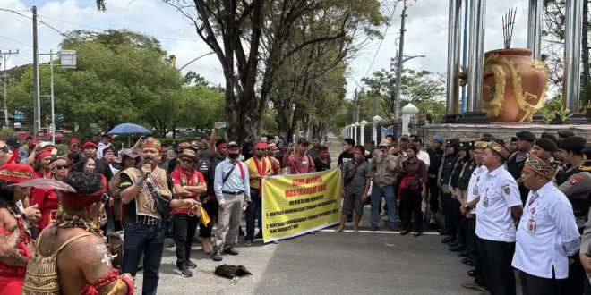 Sementara itu, aparat keamanan terlihat berjaga di beberapa titik untuk memastikan aksi berjalan tertib. Meski panas matahari menyengat, massa tetap bertahan dan meneriakkan yel-yel perjuangan sambil memukul gong kecil dan mandau sebagai simbol perlawanan adat.