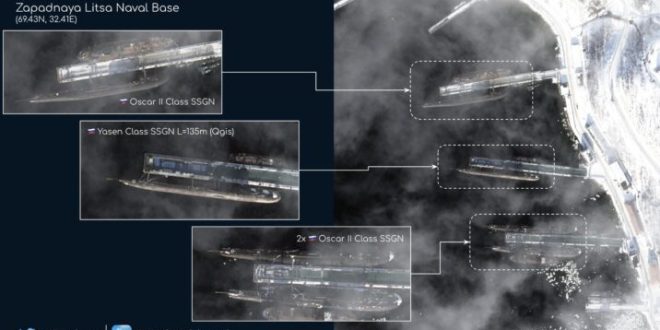RUSIA – Lima kapal selam rudal berpemandu bertenaga nuklir (SSGN) milik Angkatan Laut Rusia terdeteksi bersandar di Pangkalan Zapadnaya Litsa, Semenanjung Kola, yang berlokasi sekitar 60 km dari perbatasan Norwegia. Kehadiran armada ini terpantau melalui citra satelit yang dipublikasikan di media sosial X pada Rabu (11/3/2025).