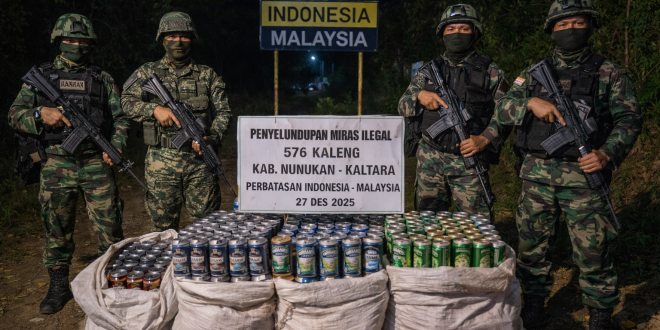 NUNUKAN – Upaya penyelundupan minuman keras ilegal di wilayah perbatasan Indonesia–Malaysia kembali berhasil digagalkan aparat keamanan. Tim Patroli Gabungan Satgas Pengamanan Perbatasan RI–Malaysia Sektor Timur Yonkav 13/Satya Lembuswana bersama unsur Tentera Darat Malaysia (TDM) Battalion 3 RAMD dan Satgas Gabungan Intelijen (SGI) menemukan ratusan kaleng minuman beralkohol tanpa izin di kawasan perbatasan Kabupaten Nunukan, Kalimantan Utara.