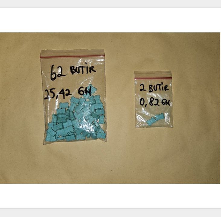 Dalam penangkapan tersebut, petugas melakukan penggeledahan dan menemukan barang bukti narkotika jenis ekstasi yang diduga siap edar. Polisi menyita sebanyak 62 butir pil ekstasi warna hijau dengan berat netto 25,42 gram dan dua butir pil ekstasi warna hijau dengan berat netto 0,82 gram. Selain itu, diamankan dua plastik klip yang digunakan sebagai pembungkus.