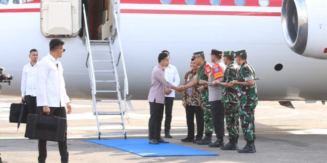 KUBU RAYA – Panglima Komando Daerah Militer XII/Tanjungpura, Mayjen TNI Jamallulael, S.Sos., M.Si., yang juga menjabat sebagai Pangkogasgabpad Pam VVIP, menyambut kedatangan Wakil Presiden Republik Indonesia, Gibran Rakabuming Raka, di Bandara Supadio, Kubu Raya, Kalimantan Barat, Jumat (22/08/2025). Penyambutan dilakukan dengan prosesi resmi yang penuh khidmat, disertai pengamanan ketat sesuai protokol VVIP.