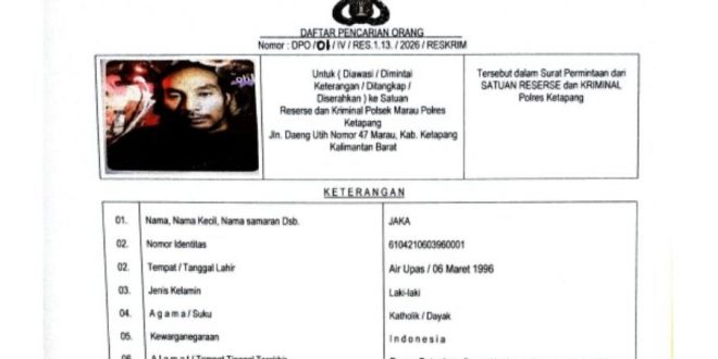 “Terduga pelaku atas nama Jaka sesuai dengan Surat Daftar Pencarian Orang Nomor: DPO/01/IV/RES.1.13./2026, saat ini dilakukan pencarian dan pengejaran bersama oleh petugas Polsek Marau dan Polres Ketapang,” ujar Kepala Kepolisian Resor (Kapolres) Ketapang, Muhammad Harris, melalui Kepala Seksi Hubungan Masyarakat (Kasi Humas) Polres Ketapang, Niptah Alimudin, dalam keterangan tertulisnya, Kamis (02/04/2026).