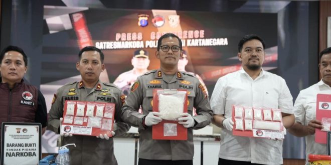 KUTAI KARTANEGARA – Kepolisian Resor (Polres) Kutai Kartanegara (Kukar) mengungkap 79 kasus narkotika sepanjang Januari hingga April 2026 dengan total 103 tersangka dan barang bukti sabu seberat 3.678,73 gram atau lebih dari 3,6 kilogram. Pengungkapan ini merupakan bagian dari operasi intensif Satuan Reserse Narkoba (Satresnarkoba) Polres Kukar dalam memberantas peredaran narkotika di wilayah tersebut.