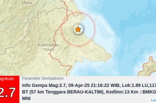 BERAU – Guncangan gempa kembali dirasakan di wilayah Bumi Batiwakkal, Kabupaten Berau, Kalimantan Timur, pada Rabu malam (09/04/2025). Berdasarkan data resmi dari Badan Meteorologi, Klimatologi, dan Geofisika (BMKG), gempa tersebut memiliki kekuatan 2,7 magnitudo dan terjadi pada pukul 22.16 WITA. Pusat gempa berada pada koordinat 1,89 Lintang Utara dan 117,86 …