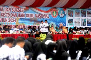 PENAJAM – PENJABAT (Pj) Bupati Penajam Paser Utara (PPU) Zainal Arifin pimpin jalannya upacara peringatan Hari Ulang Tahun (HUT) ke-79 Persatuan Guru Republik Indonesia (PGRI) dan Hari Guru Nasional (HGN) tahun 2024 di halaman depan Kantor Bupati PPU, Jalan Provinsi, Kilometer 9, Penajam, Senin (25/11/2024). Membacakan sambutan Ketua Umum Pengurus …