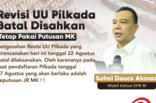 JAKARTA – Wakil Ketua DPR Sufmi Dasco Ahmad memastikan pihaknya batal mengesahkan Rancangan Undang-undang (RUU) Pilkada menjadi UU yang dijadwalkan dalam Rapat Paripurna hari ini. “Pengesahan revisi UU Pilkada yang direncanakan hari ini tanggal 22 Agustus batal dilaksanakan,” kata Dasco lewat akun media sosial X, Kamis (22/08/2024) sore. “Oleh karenanya …