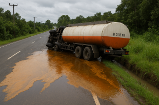 LAMANDAU — Arus lalu lintas di kawasan Simpang Sepaku, Kecamatan Bulik, Kabupaten Lamandau mendadak lumpuh, Jumat (09/01/2026), setelah sebuah truk tangki pengangkut Crude Palm Oil (CPO) terguling dan melintang di tengah jalan. Insiden itu terjadi secara tiba-tiba ketika truk bermuatan minyak sawit mentah tersebut mengalami pecah ban ganda pada roda …