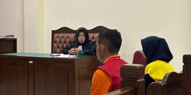 Terdakwa perempuan berinisial FD (22) dan pacarnya, ME (20), duduk bersebelahan menunggu giliran sidang. FD mengenakan kerudung biru tua dan rompi tahanan kuning, sementara ME tampil dengan rompi tahanan merah.
