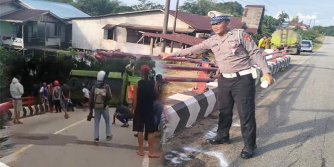 Kejadian bermula ketika sebuah mobil tangki yang dikemudikan RS melintas dari arah Tayan menuju Sosok. Diduga akibat kelelahan, sang sopir hilang kendali hingga menabrak pagar jembatan. Kendaraan besar itu lantas terguling karena muatannya kosong. “Akibat benturan, mobil tangki terguling karena muatannya kosong,” jelas Kanit Gakkum Satlantas Polres Sanggau, Aiptu Ayep Sopian.