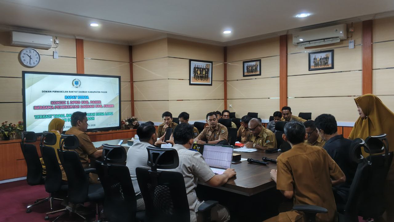 PASER — Komisi I Dewan Perwakilan Rakyat Daerah (DPRD) Kabupaten Paser menggelar rapat kerja untuk menyelesaikan permasalahan tapal batas wilayah Desa Lori dan Desa Laburan, Senin (23/02/2026). Rapat yang berlangsung di ruang rapat Penyembolum DPRD Kabupaten Paser ini dipimpin langsung oleh Ketua Komisi I DPRD Paser, Kasri, didampingi Wakil Ketua Komisi I, Umar, dan anggota Komisi I, Hamransyah.