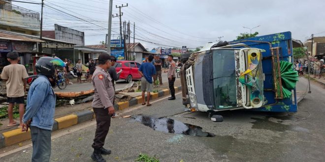 SAMARINDA – Sebuah truk tanpa muatan terguling di Jalan Dwikora, Palaran, Senin (06/10/2025), setelah hilang kendali dan menabrak median jalan, tiang lampu penerangan, serta pohon di tepi jalan. Meski sempat menghalangi jalur utama, beruntung sopir dan penumpang hanya mengalami luka ringan.