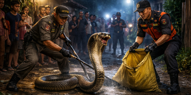 Menindaklanjuti laporan tersebut, petugas Satpol PP dan Damkar Kabupaten Hulu Sungai Utara langsung menuju lokasi kejadian. Setibanya di tempat, petugas mendapati king kobra berada di tengah jalan permukiman warga.