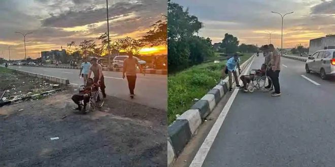 Melihat kondisi warga yang tergeletak, anggota Polsek Pontianak Timur segera menyiapkan kursi roda untuk evakuasi, memastikan korban dapat dipindahkan dengan aman.